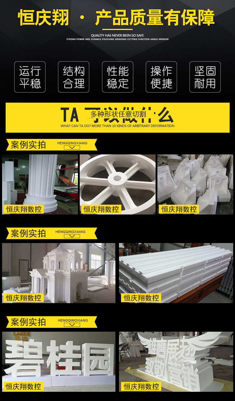EPS装饰线条切割机电脑采用XP,win7,win8控制系统,兼容CAD直接制图,数据可直接下载、导入、传输,不会出现死机、卡机、数据丢失等故障。机械运行具有行程保护功能,当运动行程超出规定行程时,设备自动保护停止。恒翔控制软件具有断电记忆,反向切割和旋转、镜向对称、间隙补偿等功能。质量性能优势:一线 控制器步进电机,性能好、超稳定、。EPS装饰线条切割机主要通过由计算机控制的执行机构(步进电机)带动发热的电热丝在X和Y方向上行走切割,从而加工出二维模型,主框架采用型材和各种连接件连接而成,运动稳定,欧式构件泡沫切割机采用步进电机,运动平稳,自由调速,适合切割图形需要不停变速的要求